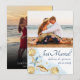 Romântica coleção de casamento em aquarela azul e dourado com sol e mar de verão. O design apresenta conchas, estrelas-do-mar e recife de coral em tons complementares de azul, dourado e branco com um toque de azul para um efeito aquático. Os seus detalhes em letras modernas em azul naval são emoldurados pela guirlanda de aquarela náutica de coral elegante, conchas e estrelas-do-mar.