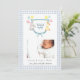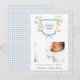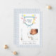 Adorável crista monogramada aquarela com animais com uma borda xadrez azul claro e branco Anúncio de Nascimento para bebê menino.