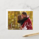 Este cartão postal de foto 'Save the Date' é a maneira perfeita de anunciar seu casamento próximo. Basta carregar sua própria foto e personalizar os detalhes na frente e no verso do cartão. Este produto foi projetado para combinar com qualquer tema de casamento.