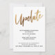 A distinção deste conjunto se deve à fonte moderna de escrita manual usada para as frases de destaque. Nesta peça, a fonte manuscrita foi usada para criar um gráfico simples que diz "Atualizar", grande e em negrito. O gráfico foi aprimorado por um efeito dourado liso falso-metálico que adiciona um clima festivo. A redação do modelo no meu texto de espaço reservado é direcionada a um casamento que está sendo adiado, mas se o seu evento for cancelado, este design também pode atender a essa necessidade. Use os campos do modelo para adicionar seus detalhes pessoais e tornar este design moderno e único seu, usando qualquer redação que lhe convier! O fundo pode ser alterado para qualquer cor que você preferir. Por favor, entre em contato para qualquer solicitação especial ou para ajuda na personalização. // 105 //