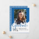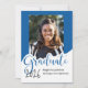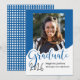 Este anúncio de graduação de fotos reluzente apresenta a palavra "formando" em letras grandes e azuis com um lugar para sua foto favorita. A parte de trás é uma design azul e branca com um boné de formatura.