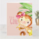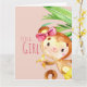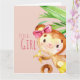 Uma menina chegou e esse macaco de cor d'água está anunciando. Verduras-da-selva com acentos cor-de-rosa brilhantes sobre fundo de madeira-de-coleira pálida. Traga o aspecto macio da aquarela e a ilustração do querido para o papel de carta e presentes para o novo pequeno. Ela é uma macaquinha precioso e vai capturar seu coração. Escreva todas as informações na parte de personalização da placa, dentro.