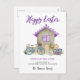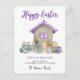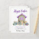 Ilustração de aquarela de uma casota, flores roxas e uma bicicleta.