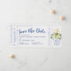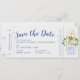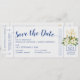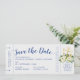 Bilhete de embarque náutico de passagem de casamento, exceto o cartão de anúncio de data com uma âncora de ouro fofinha, encaixada num arranjo floral branco e na tipografia elegante. Projetado para um casamento de praia de destino ou de navio de cruzeiro.