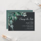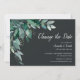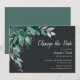 O anúncio de adiamento de casamento botânico apresenta folhas verdes de eucalipto exuberantes ilustradas em aquarela. Personalize com seus detalhes de casamento alinhados à direita em uma mistura de blocos tradicionais e tipos modernos de caligrafia em um fundo rico fora do preto. Cartões invertidos a verde florestal sólido.