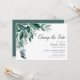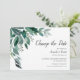 O anúncio de adiamento de casamento botânico apresenta folhas verdes de eucalipto exuberantes ilustradas em aquarela. Personalize com seus detalhes de casamento alinhados à direita em uma mistura de blocos tradicionais e tipos modernos de caligrafia. Cartões invertidos a verde florestal sólido.