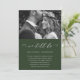 Elegante anúncio de adiamento de casamento com mudança de data em verde floresta e branco. Este anúncio simples é uma maneira sofisticada de informar aos convidados que a data do seu casamento foi remarcada devido a circunstâncias imprevistas, e inclui a nova data do casamento. Este anúncio moderno apresenta uma bela caligrafia branca "nós ainda nos casamos" em um fundo verde escuro com a foto do casal, e um verso branco do cartão.