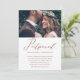 Elegante anúncio de mudança de data de adiamento de casamento. Este simples anúncio é uma maneira sofisticada de informar aos convidados que a data do casamento foi remarcada devido a circunstâncias imprevistas, e inclui a nova data do casamento. Este anúncio moderno apresenta uma bela caligrafia em falso cobre "adiado" em um fundo branco com a foto do casal, e um verso do cartão em marrom cobre.