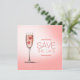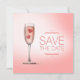 Anúncio de casamento personalizável com design fofo e romântico com uma taça de champanhe rosa contendo dois corações de doce vermelhos.