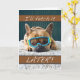 Anúncio de aposentadoria engraçado, cartão de saudação em papel com um francês, Bulldog francês vestindo uma coleira pontiaguda e óculos azuis. Imagem bonita e adorável para deixar seus amigos e família saberem que alguém pode buscá-la agora desde que você se aposenta. Design e conceito copyright © Shoaff Ballanger Studios, 2021