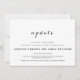 Para casais que desejam um design de casamento simples, mas elegante. Elke Clarke © O design apresenta os nomes da noiva e do noivo em uma fonte de letra elegante com a palavra "atualização". Mostrado em preto e branco, mas pode ser personalizado para as cores do seu casamento para o texto e o fundo. Adicione outros gráficos, fotos ou monograma para personalizar este modelo.