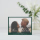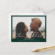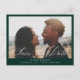 Cartão postal de aviso de data de casamento com sobreposição de caligrafia bege, foto. Fundo verde esmeralda na frente, fundo branco coordenado no verso com tipografia bege escura. O cartão apresenta um gráfico elegante de "Save the Date" em caligrafia bege na frente e no verso. Design elegante e moderno em estilo monocromático.