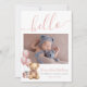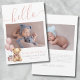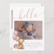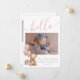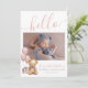 Apresentando um doce e simples anúncio de nascimento perfeito para dar as boas vindas à sua menina ao mundo. No topo, um "olá" cor-de-rosa é escrito elegantemente na tipografia do script manuscrito, definindo um tom quente e acolhedor. A frente do cartão apresenta espaços para fotos recém-nascidas e um ursinho de pelúcia bonito com balões cor-de-rosa, acrescentando um toque lúdico. Você também pode adicionar o nome, a data e a hora de nascimento e o peso do bebê - ou trocar esses detalhes por outra coisa, se preferir. As costas incluem espaço para uma nota pessoal de agradecimento ou detalhes sobre seu bebê ou gravidez. Este design está disponível como uma placa impressão ou um download digital, fazer fácil de compartilhar sua alegria com os entes queridos, por e-mail ou eletronicamente. Linda Menina, Recém-Nascida, Anúncio De Nascimento Fotográfico Para Novos Balões Rosa Bebê, Roteiro De Urso Teddy Olá. Disponível como um anúncio impresso ou como um anúncio digital para download que você pode enviar por e-mail ou que foi impresso localmente!