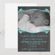Anúncio de bebê fotográfico elegante e elegante e elegante, em turquesa, com uma simples design de folha e vinha na área fotográfica. Personalize este maravilhoso anúncio com uma foto do seu pacote de alegria e todos os detalhes interessantes! Clique em "Personalizar" para encontrar mais opções de personalização.