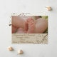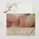 Anúncio elegante para bebês, com uma fotografia de pés para bebês no topo e uma área de texto leve e bronzeada no fundo decorada, com um bonito trabalho de arte escrolly castanho. Personalize o texto na frente e no verso em cores, estilos e tamanhos para se adequar às suas necessidades individuais.
