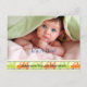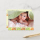 A foto do seu bebê menino de um lado e seus importantes registros de nascimento do outro. Guinchos amarelos, laranjas e verdes e estatísticas de nascimento do bebê.
