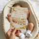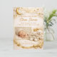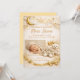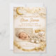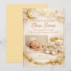 Dê as boas-vindas ao seu pequeno príncipe com este elegante cartão de anúncio de nascimento de menino, apresentando um tema sonhador de lua e estrelas em dourado. Projetado com tons neutros suaves, nuvens delicadas e sotaques dourados luxuosos, este cartão cria uma maneira atemporal e sofisticada de apresentar seu recém-nascido.