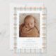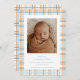 Anuncie a chegada do seu pequeno anúncio de nascimento com um bebê encantador, apresentando um design de xadrez azul e laranja perfeito para o outono! As cores aconchegantes e sazonais dão a este anúncio uma sensação calorosa e acolhedora, fazer uma bela maneira de compartilhar suas alegres notícias com familiares e amigos. Totalmente personalizável com os detalhes do seu bebê e uma mensagem especial, este anúncio é uma forma na moda e sincera de introduzir a sua mais nova adição ao mundo. Perfeito para um anúncio de nascimento com tema de outono!