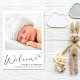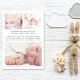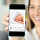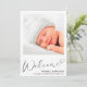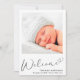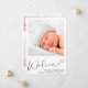 Um bebê simples e elegante para o anúncio de nascimento de uma menina. A frente apresenta a foto do seu recém-nascido, o nome do cheio, a data de chegada e as estatísticas de natalidade, e "Bem-vindo" em um roteiro de na moda com um coração florescente. No verso do cartão, adicione mais três fotos e nomes de pais e irmãos, e um obrigado, visita ou outra mensagem.