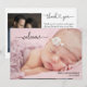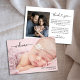 Um simples anúncio de nascimento com a foto do seu recém-nascido e uma sobreposição de "bem-vindo" em uma fonte branca estilosa. Basta adicionar o nome do seu bebê e a data de nascimento. O verso, com um "obrigado" estiloso, é o local perfeito para uma mensagem personalizada e outra foto. Basta clicar no botão de editar/personalisar para personalizar este design.