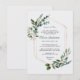 Envie um anúncio à família e aos amigos para informá-los de que seu chá de panela foi cancelado e que os convidados agora podem enviar seu presente ou cartão. Cartão com aquarela verde com folhagem numa moldura geométrica dourada. Personalize com suas informações ou clique em "Clique para personalizar mais" para editar estilos de fonte, tamanho e cores.