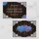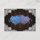 Anuncie o adiamento do seu casamento com este cartão de anúncio roxo e azul com flores de hydrangea roxas e azuis em um fundo de madeira rústica adornado com rendas florais brancas.