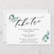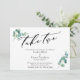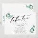 Se os planos do seu casamento mudaram inevitavelmente, este cartão simples e elegante pode ser a opção perfeita para você. Com uma fonte de caligrafia luxuosa, o cabeçalho lê "take two". Tudo o mais é versátil e pode ser editado: altere a fonte ou as cores de apoio. Os cantos são acentuados com raminhos de folhas de eucalipto aquarela. Use os campos do modelo para adicionar seus detalhes pessoais. // 137 //