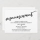 A distinção deste conjunto se deve à fonte moderna de escrita manual usada para as frases de acentuação. No caso de você precisar informar aos seus convidados que o seu casamento foi cancelado, este cartão oferece uma opção ousada e atraente. Nesta peça, a fonte de letra manual foi usada para criar um gráfico simples que representa a palavra "anúncio". Use os campos do modelo para adicionar seus detalhes pessoais e tornar este design moderno e único seu. O fundo branco pode ser alterado para qualquer cor que você preferir. Entre em contato para qualquer solicitação especial ou para obter ajuda na personalização. // 100 //