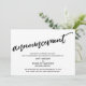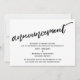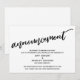 A distinção deste conjunto se deve à fonte moderna de roteiro escrita à mão usada para frases de destaque. No caso de você precisar informar aos seus convidados que o seu casamento foi cancelado, este cartão oferece uma opção ousada e atraente. Nesta peça, a fonte de roteiro manuscrita foi usada para criar um gráfico simples que representa a palavra "anúncio". Use os campos do modelo para adicionar seus detalhes pessoais e tornar este design moderno e único seu. O fundo branco pode ser alterado para qualquer cor que você preferir. Entre em contato para qualquer pedido especial ou para assistência de personalização. // 100 //