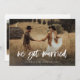Este simples e rústico cartão de anúncio de fuga para casamento apresenta uma foto pessoal do casamento na frente, com as palavras "nos casamos" em uma fonte casual, branca e manuscrita. O verso do cartão tem espaço para outra foto, além de espaço para detalhar os pormenores da fuga ou fornecer detalhes para uma recepção ou celebração após o casamento. Um design caprichoso e elegante que é a maneira perfeita de informar amigos e familiares que você acabou de se casar, especialmente após um micro casamento ou casamento onde apenas uma pequena quantidade de convidados pôde ser convidada.