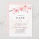 As flores mais suaves de cereja cor-de-rosa descem em um galho no topo desta mudança moderna e minimalista no anúncio do casamento. Uma lavagem cor-de-água rosa mal existe adiciona dimensão. O convite de volta também é cor-de-rosa-claro. O resultado é uma aquarela botânica moderna.