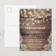 Mantenha amigos e familiares atualizados em estilo com estes cartões postais rústicos. Este design com o tema do país apresenta um fundo de madeira, luzes cintilantes de cordas e um espaço branco intricado. Seus detalhes personalizados aparecem na tipografia elegante do script.
