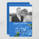 Anuncie um casamento particular com esta papelaria azul brilhante. Inclua uma foto e personalize o texto. Condecoração de flores de hydrangea azul realista. Escolha o download instantâneo e compartilhe com todos os usuários on-line para economizar dinheiro.