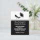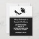 Anúncio de Save the Date de casamento de futebol caprichoso feito em preto, cinza e branco. Gráficos de um salto alto preto elegante chutando uma bola de futebol preta e cinza, decora a parte superior branca do cartão. A parte inferior do cartão é preta, com uma faixa cinza perto do topo e texto branco personalizável com as informações do seu casamento. Um verso preto tem texto branco descendo pelo lado esquerdo com a frase Save The Date. Ótimos anúncios de Save The Date para o casal fã de futebol.