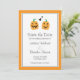 Anúncio de casamento de Halloween Save the Date fofo com duas abóboras Jack o Lantern engraçadas e risonhas com corações como símbolo de amor. Ao redor há uma borda laranja e preta. Texto preto personalizável. Adicione a data do casamento, o nome da noiva e do noivo e onde a cerimônia será realizada. Para pedidos personalizados ou ajuda com a personalização, use o link de contato da loja acima.