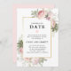 Rosas cor-de-rosa rústicas e flores de hortênsia decoram este modelo de evento adiado. As flores estão aninhadas em flores de sage verde que decoram uma moldura dourada. A parte de trás do modelo de evento adiado é um rosa suave.