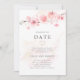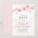 Os mais suaves botões rosa claro de flores de cerejeira repousam sobre um ramo no topo deste anúncio de casamento moderno e minimalista de mudança de data. Uma lavagem de aquarela rosa quase imperceptível adiciona dimensão. O verso do convite também é rosa claro. O resultado é uma aquarela botânica moderna.