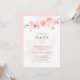 As flores de cerejeira rosa suave repousam num ramo no topo deste anúncio de casamento moderno e minimalista de mudança de data. Uma lavagem de aquarela rosa quase imperceptível adiciona dimensão. O verso do convite também é rosa suave. O resultado é uma aquarela botânica moderna.