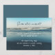 Anuncie que você é casado com cartões de praia. Personalize o texto em dois lugares sobre uma imagem de fundo do oceano azul. O texto no topo tem muitas opções como, "Adivinhem quem é casado?", "Nós amarramos o nó", ou "Nós somos o Sr. & Sra." Na parte inferior, o texto impresso branco contém todas as informações sobre a cerimônia privada. O reverso é azul escuro sólido.