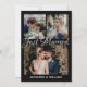 Anuncie seu casamento aos seus amigos e família por este cartão moderno. O design tem três colagens de fotos na frente com texto branco de caligrafia "Recem casados" e os nomes das recém-casadas. No verso, você tem uma foto no topo e o parágrafo de texto de detalhes do casamento abaixo. Personalize o cartão com suas fotos, detalhes do casamento, data do casamento e nomes.