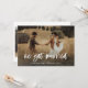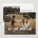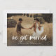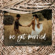 Este simples e rústico cartão de anúncio de fuga para o casamento apresenta uma foto pessoal do casamento na frente, com as palavras "nos casamos" em letra cursiva branca casual. O verso do cartão tem espaço para outra foto, além de espaço para detalhar os pormenores da fuga ou fornecer detalhes para uma recepção ou celebração após o casamento. Um design caprichoso e elegante que é a maneira perfeita de informar amigos e familiares que você está casado, especialmente após um micro-casamento ou casamento onde apenas uma pequena quantidade de convidados pôde ser convidada.