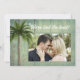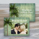 Anuncie um casamento privado em um local tropical. Os anúncios de modelo de foto têm fundo de madeira desgastada e design de palmeiras. Tema rústico e tropical, com foto do casal na frente e texto "Nós amarrámos o nó". Inclua nomes e local do evento no verso. Design vertical com personalização em ambos os lados. Escolha a opção impressa ou para download. Personalize facilmente e compartilhe online.