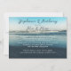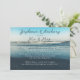 Anúncio de casamento com cena de oceano azul combinado com um convite para um recepção para os recém-casados. Os cartões horizontais têm uma vista da praia, com ondas quebrando, como fundo para texto personalizado. Letra preta no topo para nomes e "Sr. e Sra." com texto impresso em branco na parte inferior para incluir data e local da cerimônia privada com informações do convite. Cores azul marinho. Se você alterar os tamanhos de papel, certifique-se de que todo o seu texto caiba e seja impresso bem longe das bordas do papel.