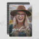 Um simples script clássico "formando" em branco acentua uma foto vertical solteiro do seu formando. Este anúncio de graduação funciona tanto para formandos da faculdade quanto para segundos graus e é simples o suficiente para deixar sua foto brilhar. É um design de eterno e também apresenta um backer distribuído com uma cor personalizável (o padrão é cinza de carvão).