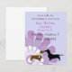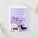 Bonitos anúncios de Save the Date de casamento feitos em azul pervinca, com uma grande flor roxa e branca estilosa. Gráficos de um dachshund marrom e um preto, com corações de lavanda entre eles, decoram a parte inferior do cartão. Todo o texto é personalizável para atender às suas necessidades. Fofo para os amantes de dachshunds e uma ótima maneira de anunciar seu próximo casamento para convidados de fora da cidade.