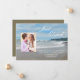 Este anúncio de casamento de fuga romântica é perfeito para qualquer pessoa que teve um casamento à beira-mar ou na praia. O design apresenta uma cena de praia com uma foto do casal feliz. As palavras "Fugimos" aparecem no céu e os detalhes da fuga são escritos na areia. Uma ótima maneira de contar a todos que você fugiu para se casar. Copyright henishouseofpaper