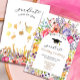 Anúncio de Convite para Primavera de Flor Selvagem bonito. Este design apresenta um arranjo de flores aquarelas em tons de rosa e roxo, e amarelo em verde-jardim rústico.