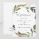Estes cartões de anúncio de elopemento verde de outono têm um belo design de outono. A design moderna rústica apresenta folhas azuis marinhos, verdes-sábios e douradas com espirros de flores azuis escuras. Personalize a placa com os detalhes do seu casamento e use a seção modelo na parte traseira para obter informações de recepção, para anunciar uma mudança de endereço ou para quaisquer outros detalhes que você gostaria de compartilhar.