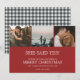Anuncie seu noivado recente com este cartão de Natal vermelho "Ela disse sim!", apresentando três das suas fotos de noivado. Personalize o modelo com suas fotos (recorte em formato quadrado antes de fazer o upload para obter melhores resultados). A frente deste cartão de Natal de anúncio de noivado diz - Ela disse sim! Desejando à nossa família e amigos um Feliz Natal e um ano novo feliz e saudável. Personalize o rodapé do cartão com seus nomes. O verso do cartão tem um design xadrez de búfalo preto e branco. Entre em contato através do botão abaixo se precisar de ajuda ou personalização adicional.