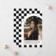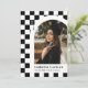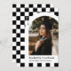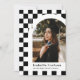 Este anúncio de graduação moderno e único apresenta um fundo branco e preto de verificação, destacando uma fotografia do formando enquadrada em um arco branco com o nome do formando e a escola embaixo. Um pequeno boné de gradação é exibido de forma inteligente no fundo verificado com o ano de graduação do formando. A parte de trás tem um padrão marcado de correspondência divertida no mesmo branco e preto.